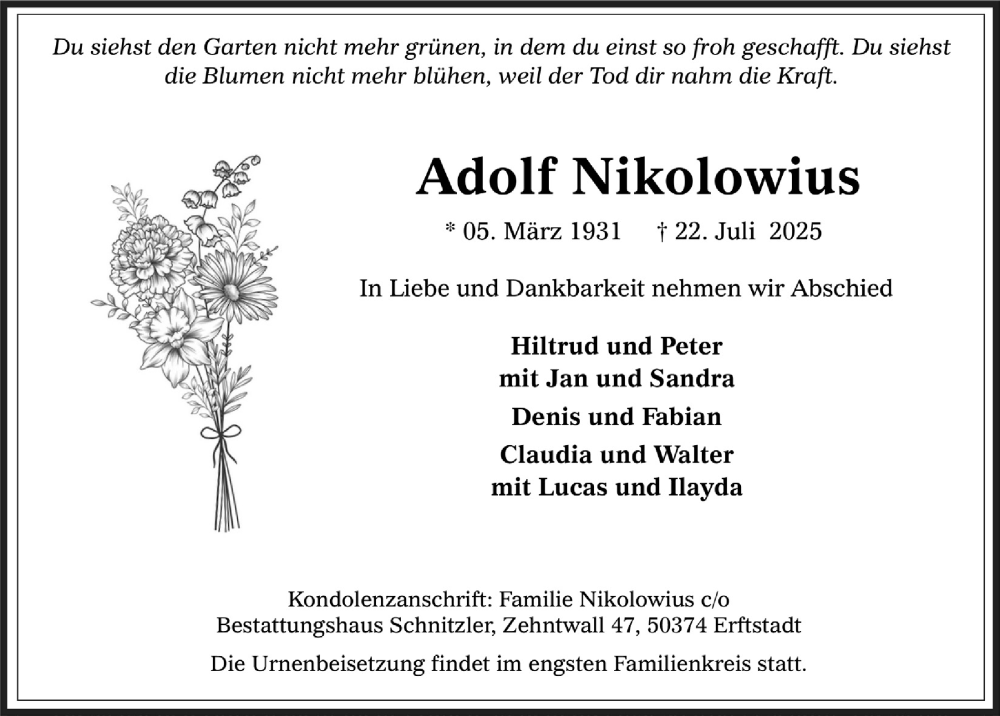 Hier finden Sie alle Traueranzeigen aus der Zeitung, die bisher für Adolf Nikolowius erschienen sind. Weitere Traueranzeigen, die in der Zeitung erscheinen, werden hier ebenfalls aufgelistet
