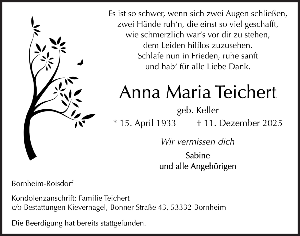 Hier finden Sie alle Traueranzeigen aus der Zeitung, die bisher für Anna Maria Teichert erschienen sind. Weitere Traueranzeigen, die in der Zeitung erscheinen, werden hier ebenfalls aufgelistet