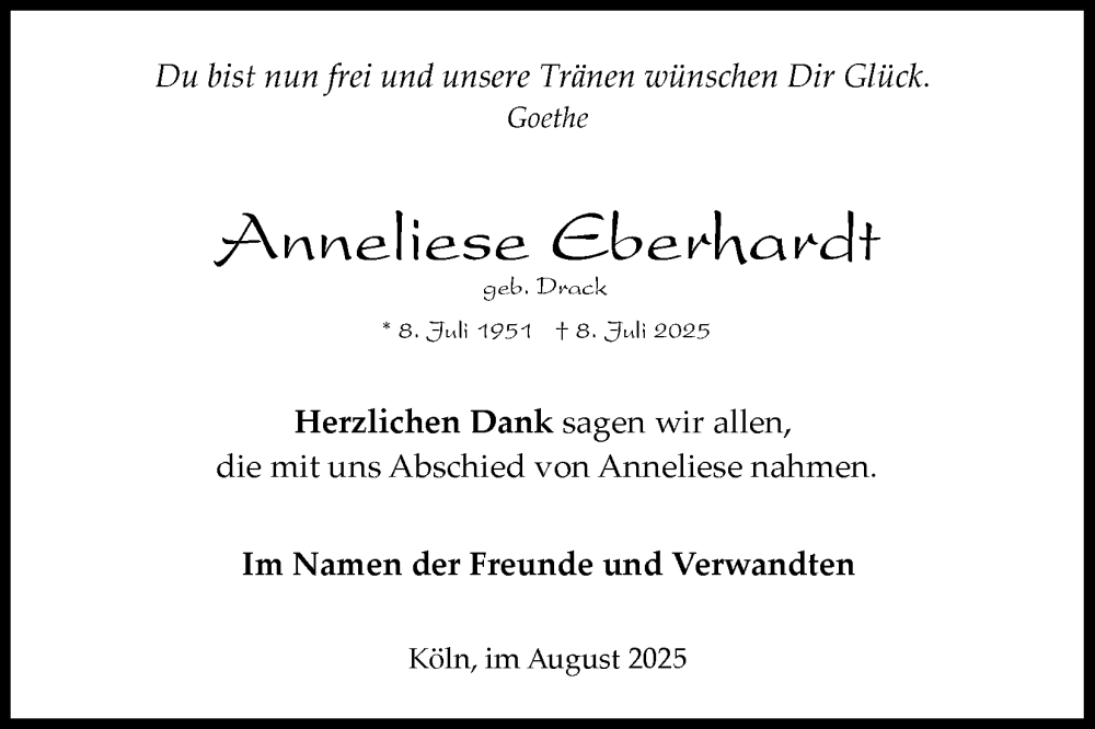 Hier finden Sie alle Traueranzeigen aus der Zeitung, die bisher für Anneliese Eberhardt erschienen sind. Weitere Traueranzeigen, die in der Zeitung erscheinen, werden hier ebenfalls aufgelistet