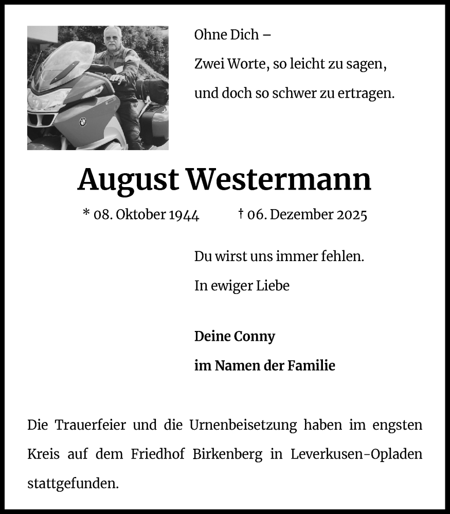 Hier finden Sie alle Traueranzeigen aus der Zeitung, die bisher für August Westermann erschienen sind. Weitere Traueranzeigen, die in der Zeitung erscheinen, werden hier ebenfalls aufgelistet