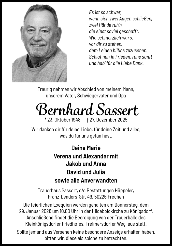 Hier finden Sie alle Traueranzeigen aus der Zeitung, die bisher für Bernhard Sassert erschienen sind. Weitere Traueranzeigen, die in der Zeitung erscheinen, werden hier ebenfalls aufgelistet