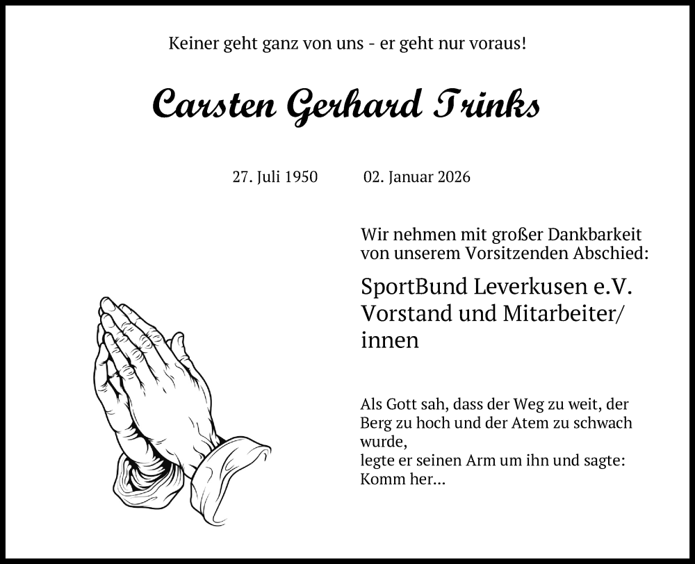 Hier finden Sie alle Traueranzeigen aus der Zeitung, die bisher für Carsten Gerhard erschienen sind. Weitere Traueranzeigen, die in der Zeitung erscheinen, werden hier ebenfalls aufgelistet