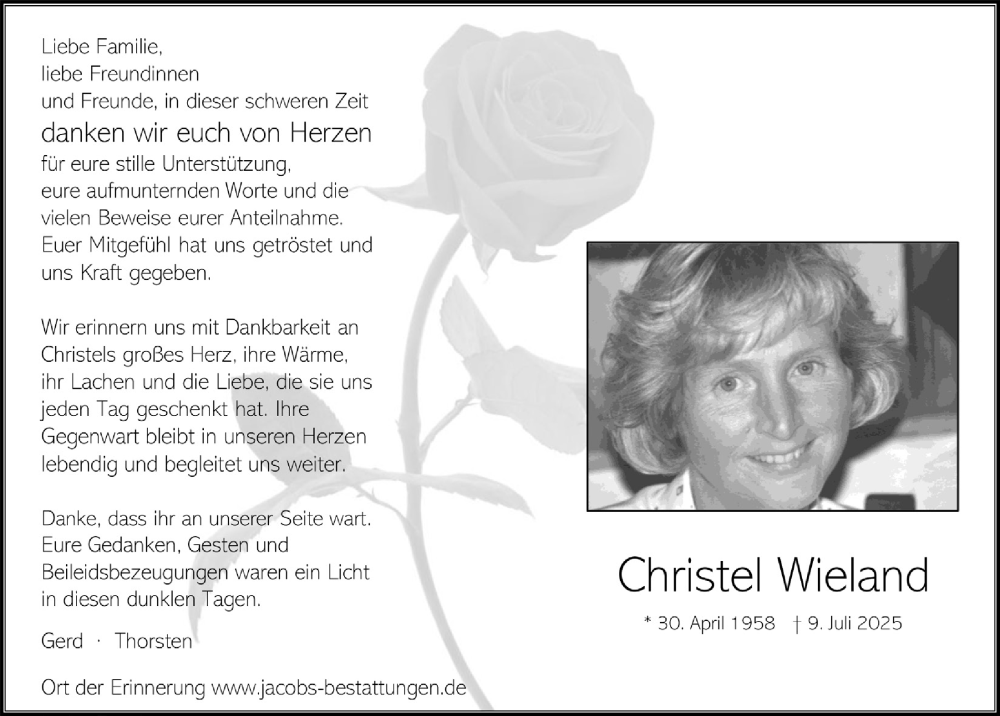 Hier finden Sie alle Traueranzeigen aus der Zeitung, die bisher für Christel Wieland erschienen sind. Weitere Traueranzeigen, die in der Zeitung erscheinen, werden hier ebenfalls aufgelistet