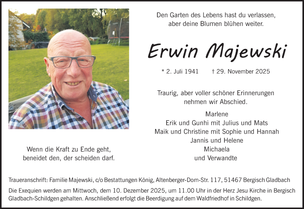 Hier finden Sie alle Traueranzeigen aus der Zeitung, die bisher für Erwin Majewski erschienen sind. Weitere Traueranzeigen, die in der Zeitung erscheinen, werden hier ebenfalls aufgelistet