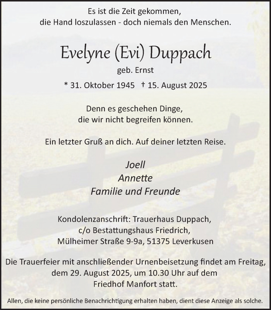 Hier finden Sie alle Traueranzeigen aus der Zeitung, die bisher für Evelyne Duppach erschienen sind. Weitere Traueranzeigen, die in der Zeitung erscheinen, werden hier ebenfalls aufgelistet