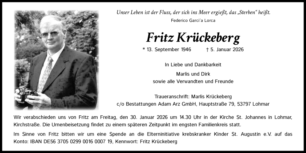 Hier finden Sie alle Traueranzeigen aus der Zeitung, die bisher für Fritz Krückeberg erschienen sind. Weitere Traueranzeigen, die in der Zeitung erscheinen, werden hier ebenfalls aufgelistet