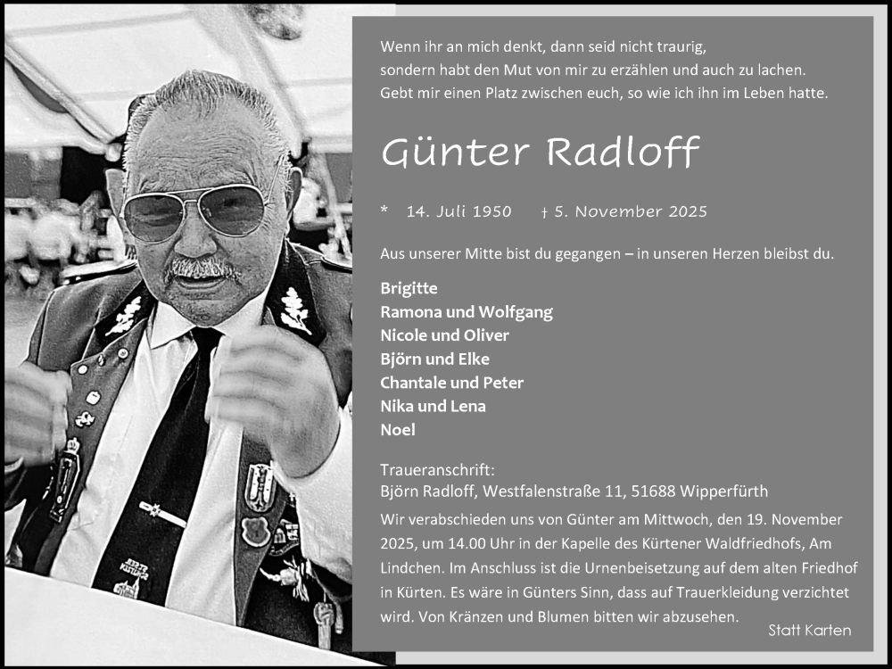 Hier finden Sie alle Traueranzeigen aus der Zeitung, die bisher für Günter Radloff erschienen sind. Weitere Traueranzeigen, die in der Zeitung erscheinen, werden hier ebenfalls aufgelistet