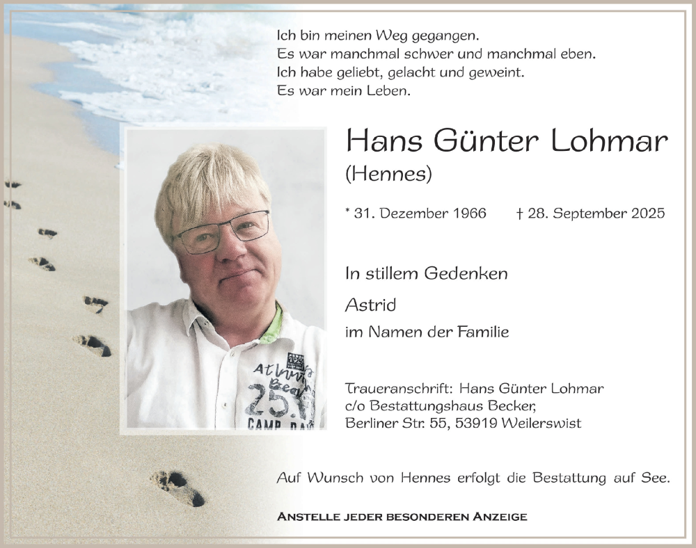 Hier finden Sie alle Traueranzeigen aus der Zeitung, die bisher für Hans Günter Lohmar erschienen sind. Weitere Traueranzeigen, die in der Zeitung erscheinen, werden hier ebenfalls aufgelistet