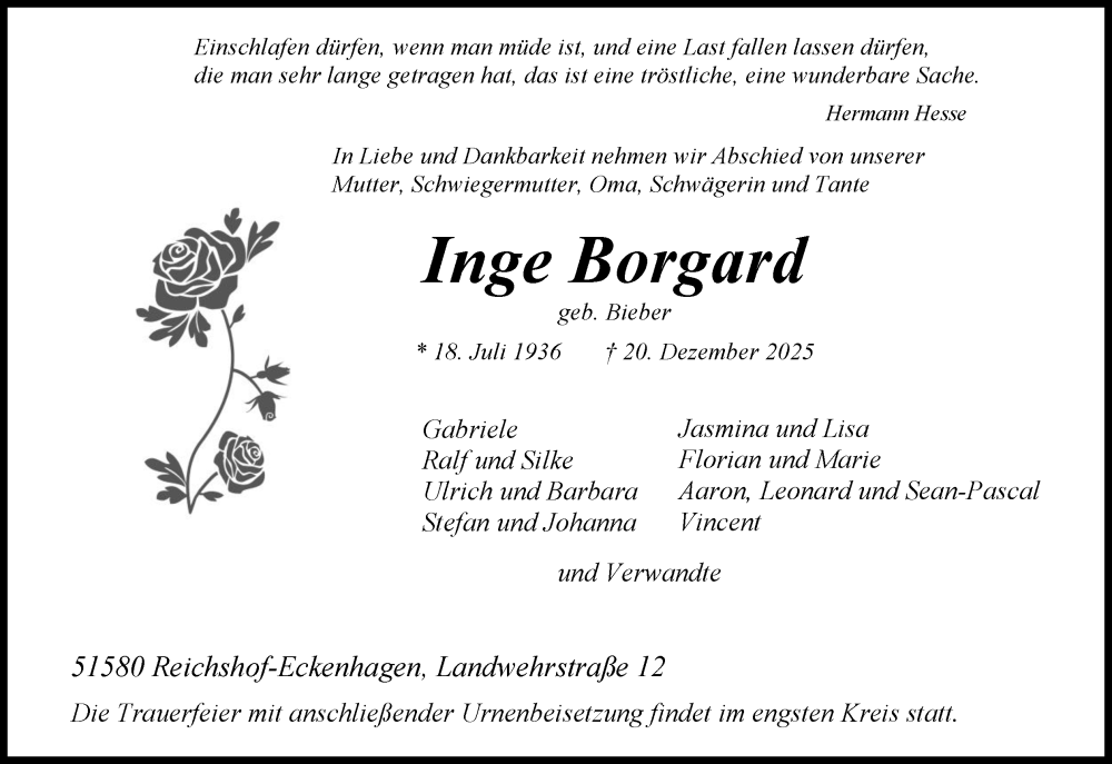 Hier finden Sie alle Traueranzeigen aus der Zeitung, die bisher für Inge Borgard erschienen sind. Weitere Traueranzeigen, die in der Zeitung erscheinen, werden hier ebenfalls aufgelistet