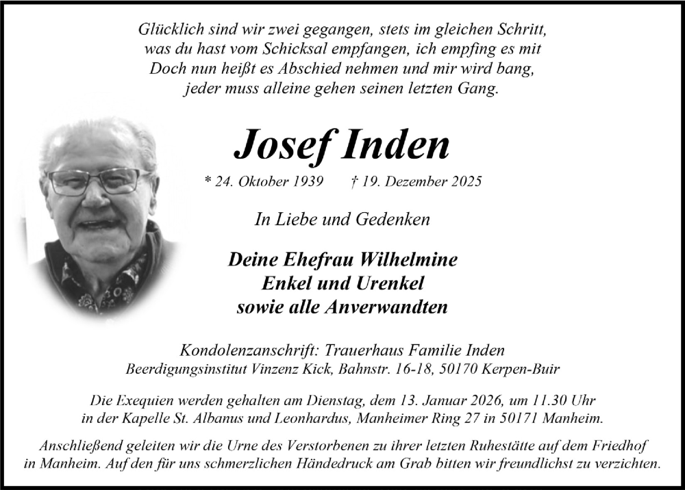 Hier finden Sie alle Traueranzeigen aus der Zeitung, die bisher für Josef Inden erschienen sind. Weitere Traueranzeigen, die in der Zeitung erscheinen, werden hier ebenfalls aufgelistet