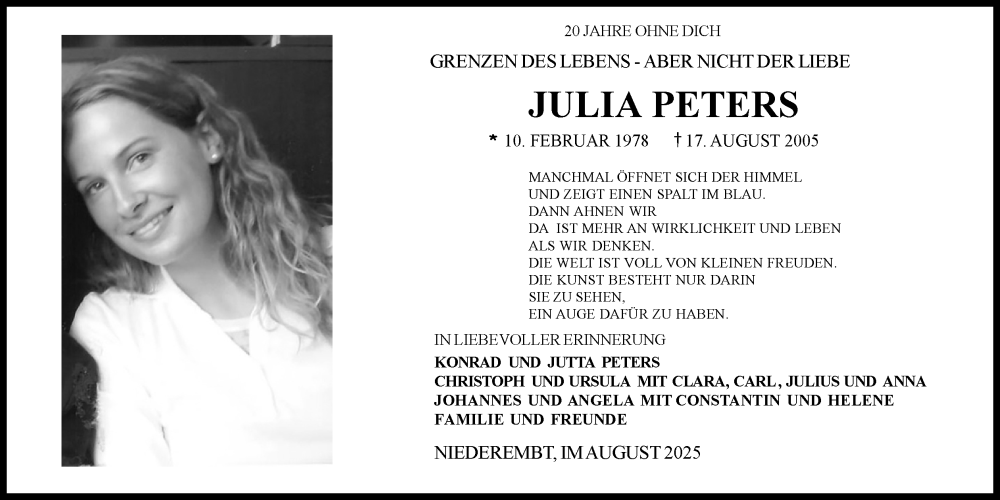 Hier finden Sie alle Traueranzeigen aus der Zeitung, die bisher für Julia Peters erschienen sind. Weitere Traueranzeigen, die in der Zeitung erscheinen, werden hier ebenfalls aufgelistet