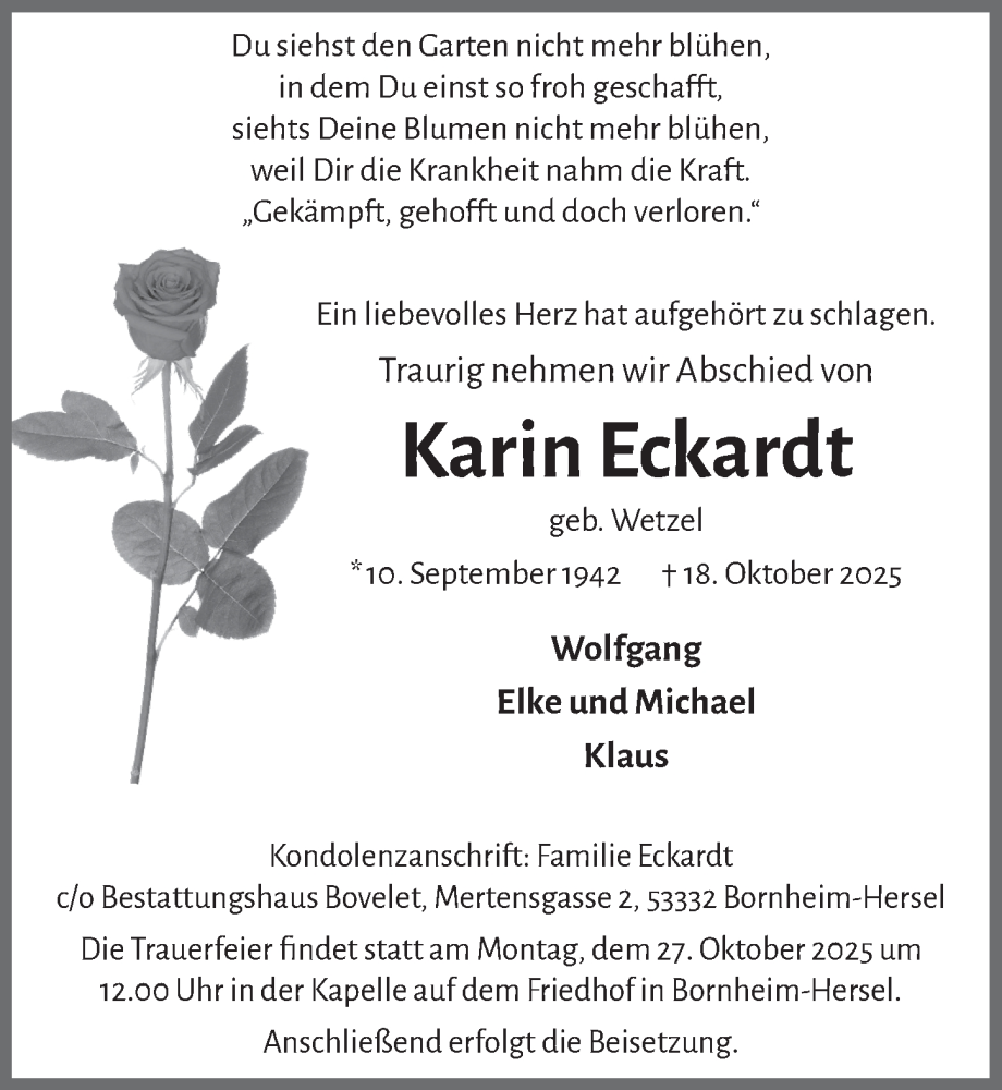 Hier finden Sie alle Traueranzeigen aus der Zeitung, die bisher für Karin Eckardt erschienen sind. Weitere Traueranzeigen, die in der Zeitung erscheinen, werden hier ebenfalls aufgelistet