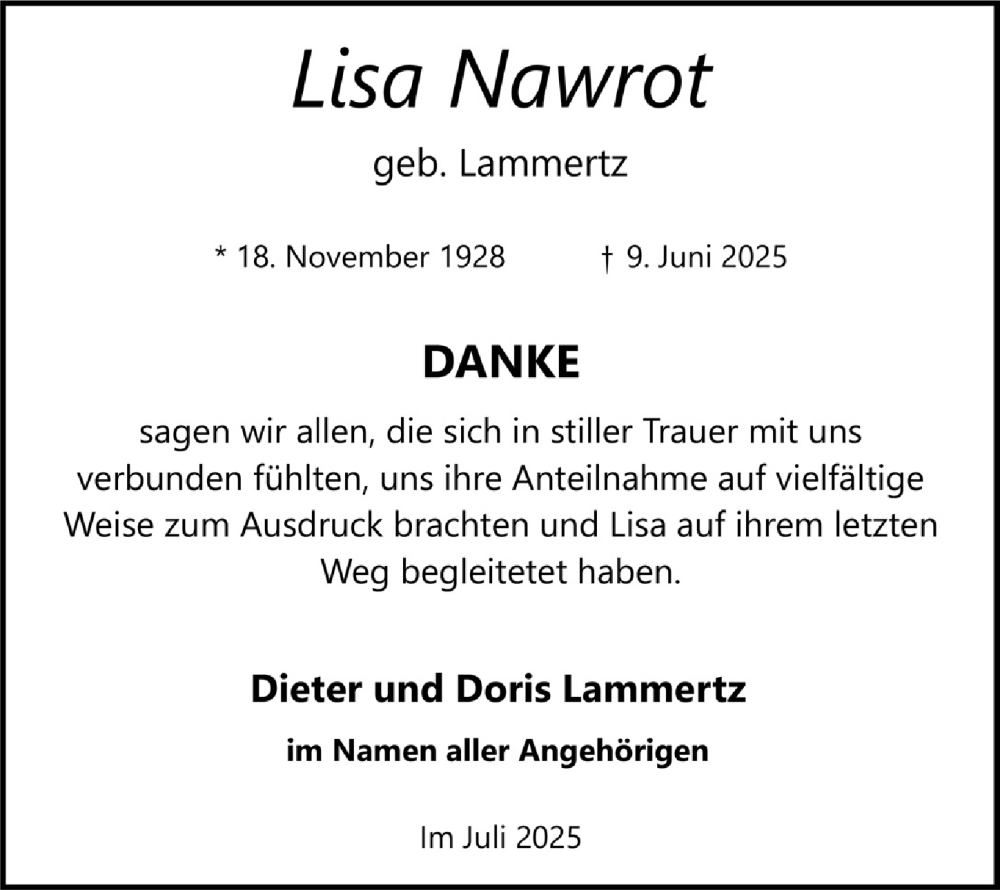Hier finden Sie alle Traueranzeigen aus der Zeitung, die bisher für Lisa Nawrot erschienen sind. Weitere Traueranzeigen, die in der Zeitung erscheinen, werden hier ebenfalls aufgelistet