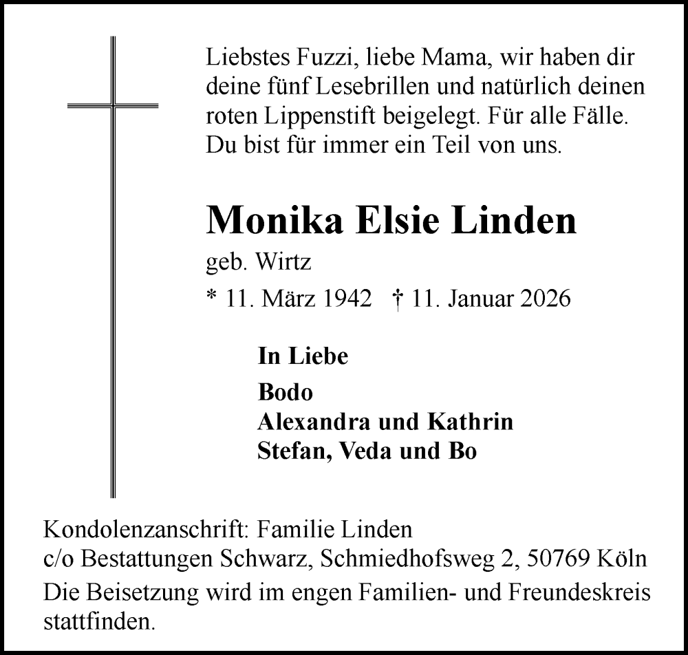 Hier finden Sie alle Traueranzeigen aus der Zeitung, die bisher für Monika Elsie Linden erschienen sind. Weitere Traueranzeigen, die in der Zeitung erscheinen, werden hier ebenfalls aufgelistet