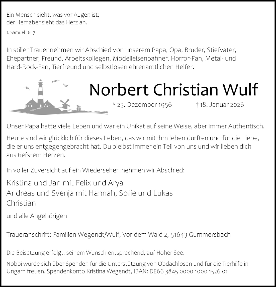 Hier finden Sie alle Traueranzeigen aus der Zeitung, die bisher für Norbert Christian Wulf erschienen sind. Weitere Traueranzeigen, die in der Zeitung erscheinen, werden hier ebenfalls aufgelistet