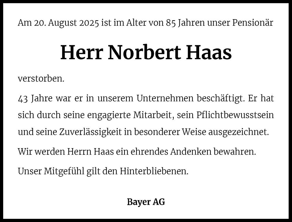 Hier finden Sie alle Traueranzeigen aus der Zeitung, die bisher für Norbert Haas erschienen sind. Weitere Traueranzeigen, die in der Zeitung erscheinen, werden hier ebenfalls aufgelistet