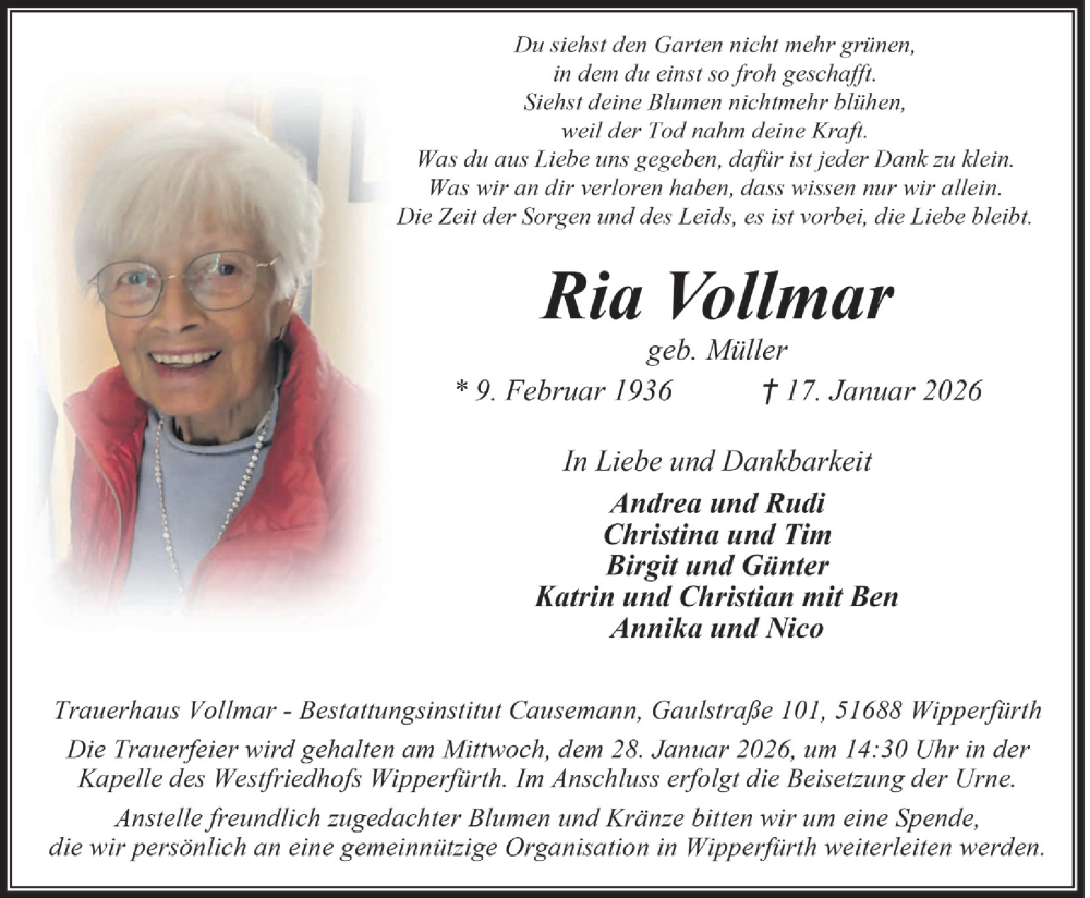 Hier finden Sie alle Traueranzeigen aus der Zeitung, die bisher für Ria Vollmar erschienen sind. Weitere Traueranzeigen, die in der Zeitung erscheinen, werden hier ebenfalls aufgelistet