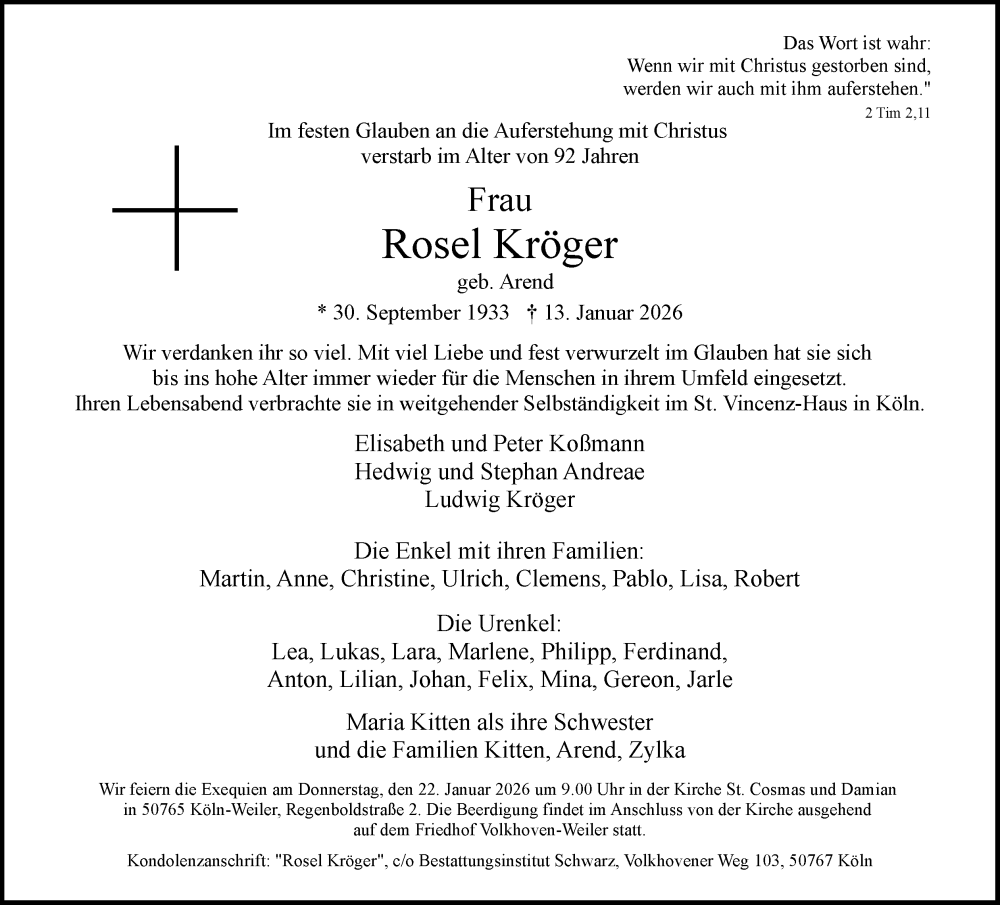 Hier finden Sie alle Traueranzeigen aus der Zeitung, die bisher für Rosel Kröger erschienen sind. Weitere Traueranzeigen, die in der Zeitung erscheinen, werden hier ebenfalls aufgelistet