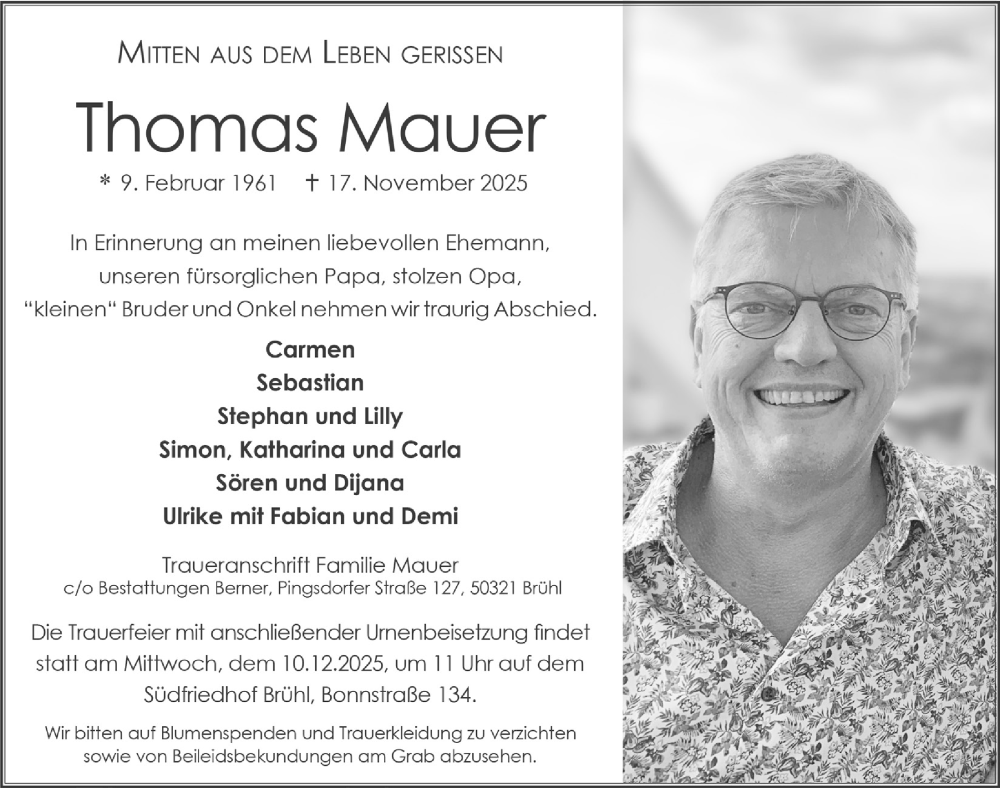 Hier finden Sie alle Traueranzeigen aus der Zeitung, die bisher für Thomas Mauer erschienen sind. Weitere Traueranzeigen, die in der Zeitung erscheinen, werden hier ebenfalls aufgelistet