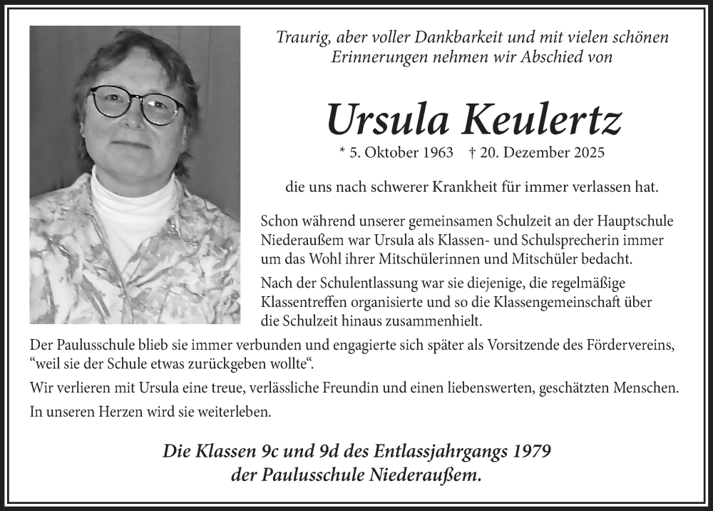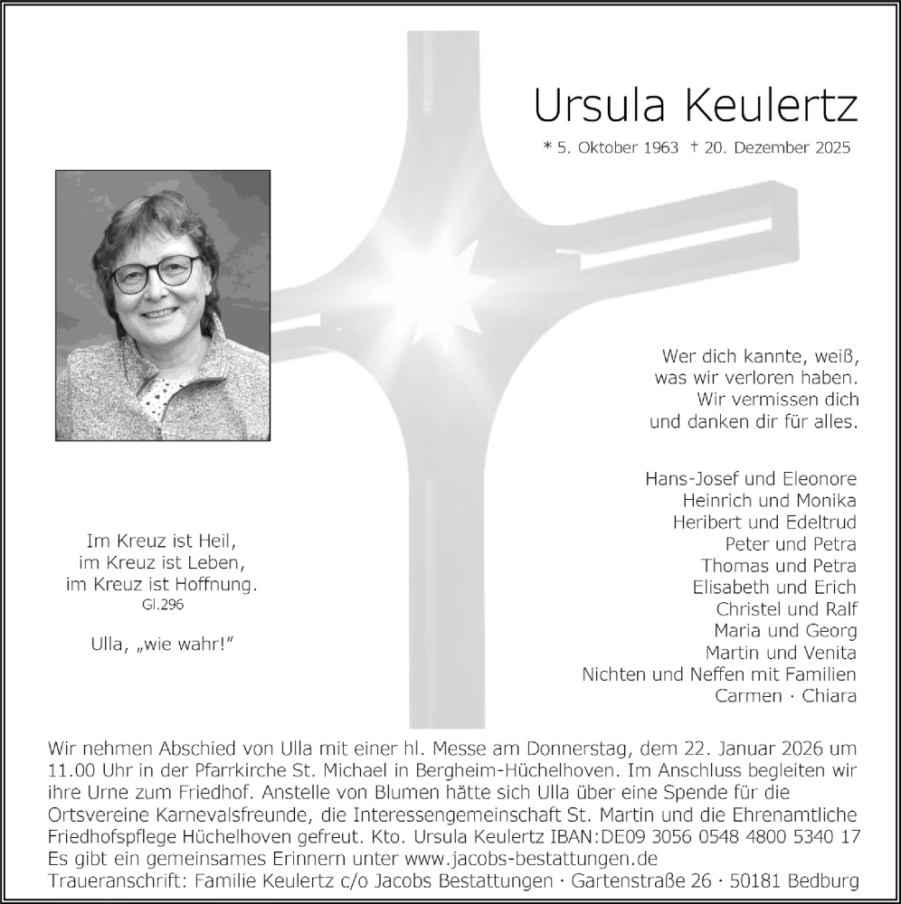 Hier finden Sie alle Traueranzeigen aus der Zeitung, die bisher für Ursula Keulertz erschienen sind. Weitere Traueranzeigen, die in der Zeitung erscheinen, werden hier ebenfalls aufgelistet