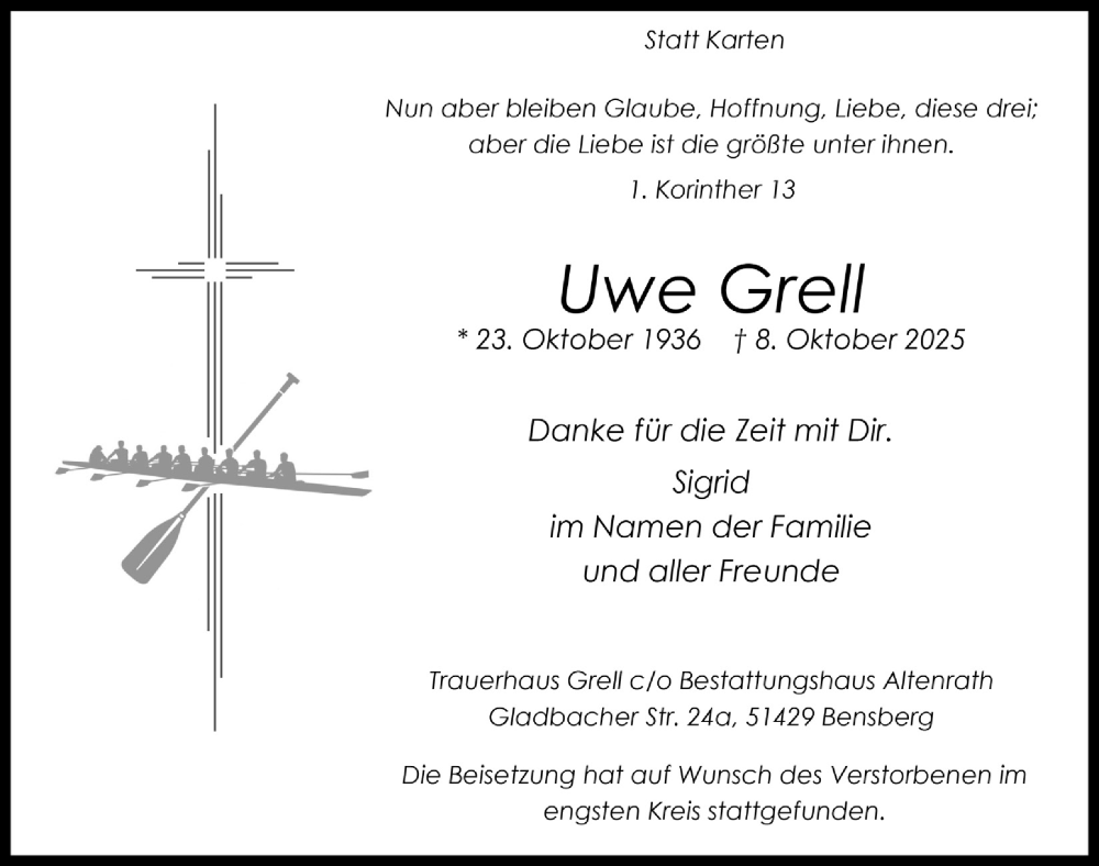 Hier finden Sie alle Traueranzeigen aus der Zeitung, die bisher für Uwe Grell erschienen sind. Weitere Traueranzeigen, die in der Zeitung erscheinen, werden hier ebenfalls aufgelistet