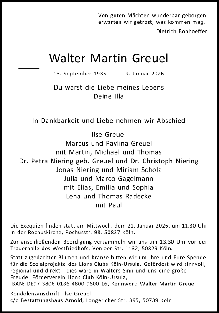 Hier finden Sie alle Traueranzeigen aus der Zeitung, die bisher für Walter Martin Greuel erschienen sind. Weitere Traueranzeigen, die in der Zeitung erscheinen, werden hier ebenfalls aufgelistet