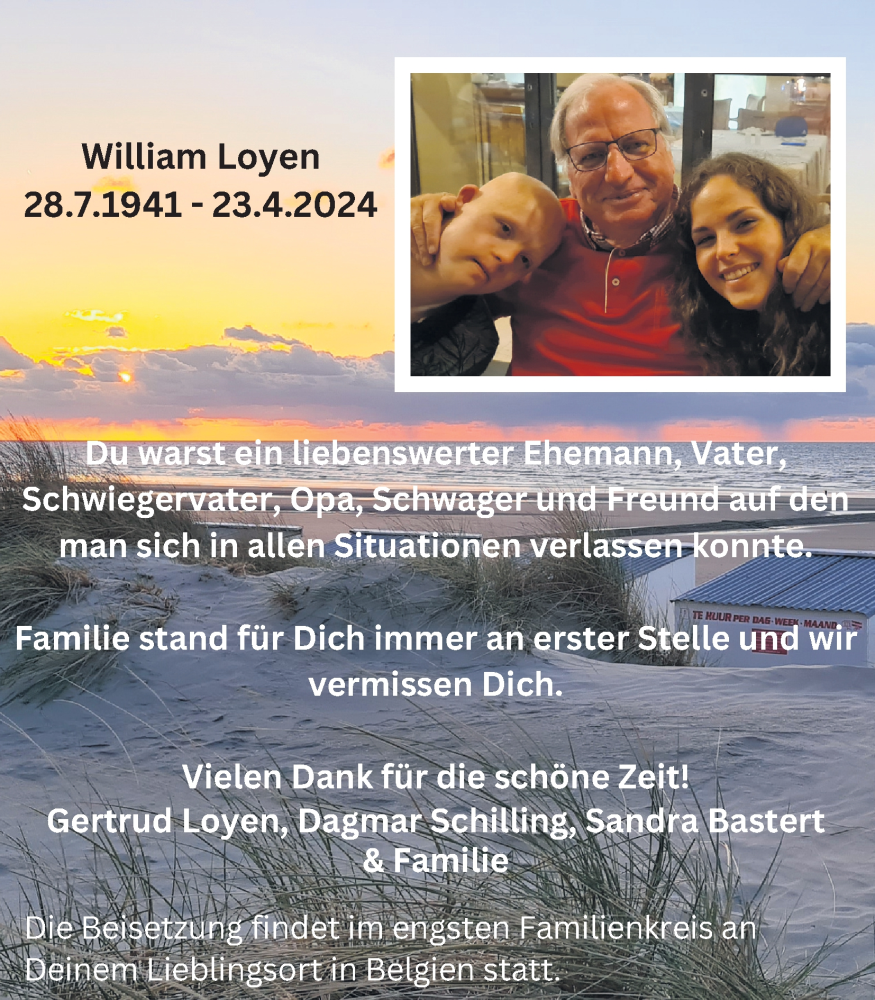 Hier finden Sie alle Traueranzeigen aus der Zeitung, die bisher für William Loyen erschienen sind. Weitere Traueranzeigen, die in der Zeitung erscheinen, werden hier ebenfalls aufgelistet